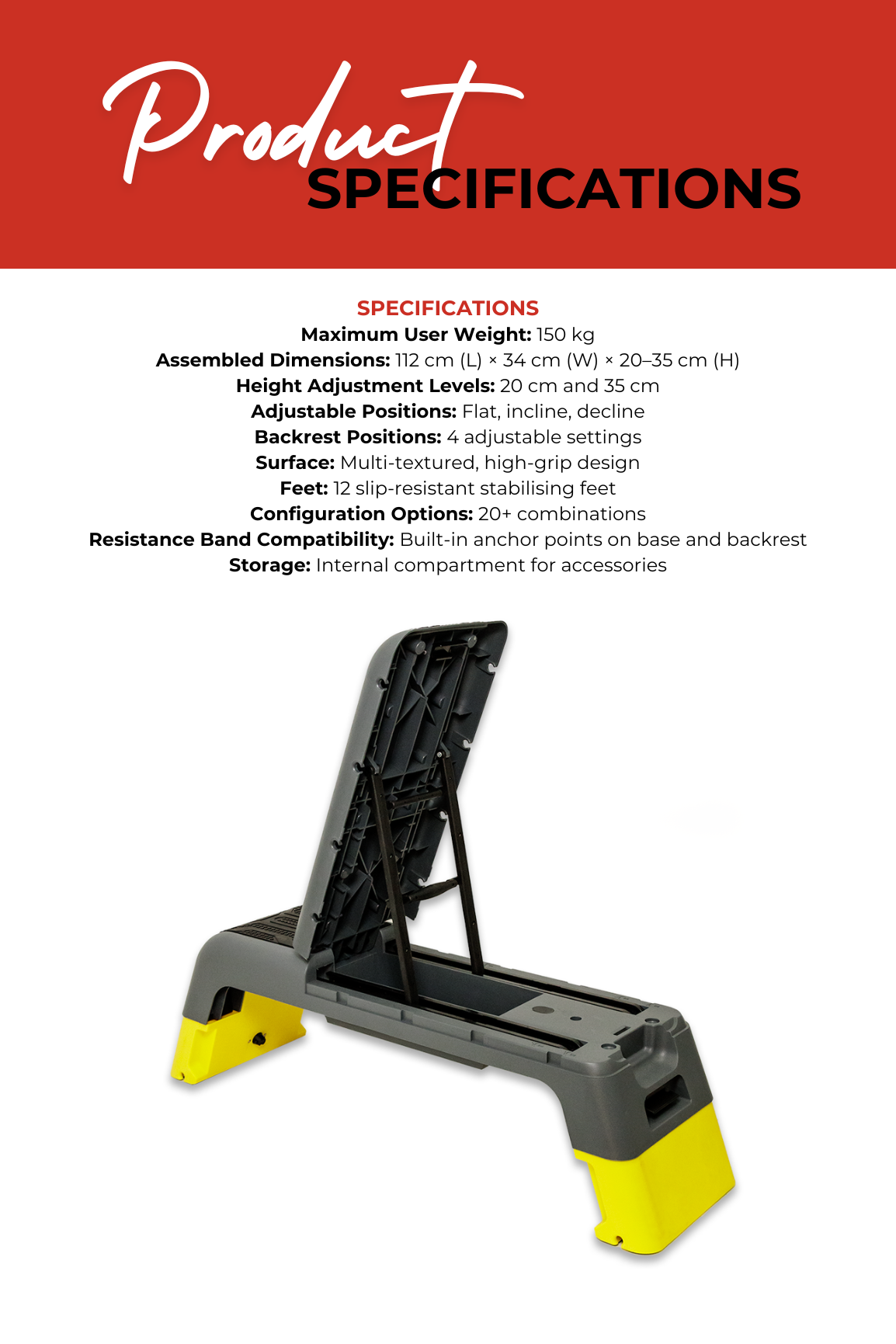 • All-in-one functionality: step platform, adjustable bench, and band anchor in one unit.