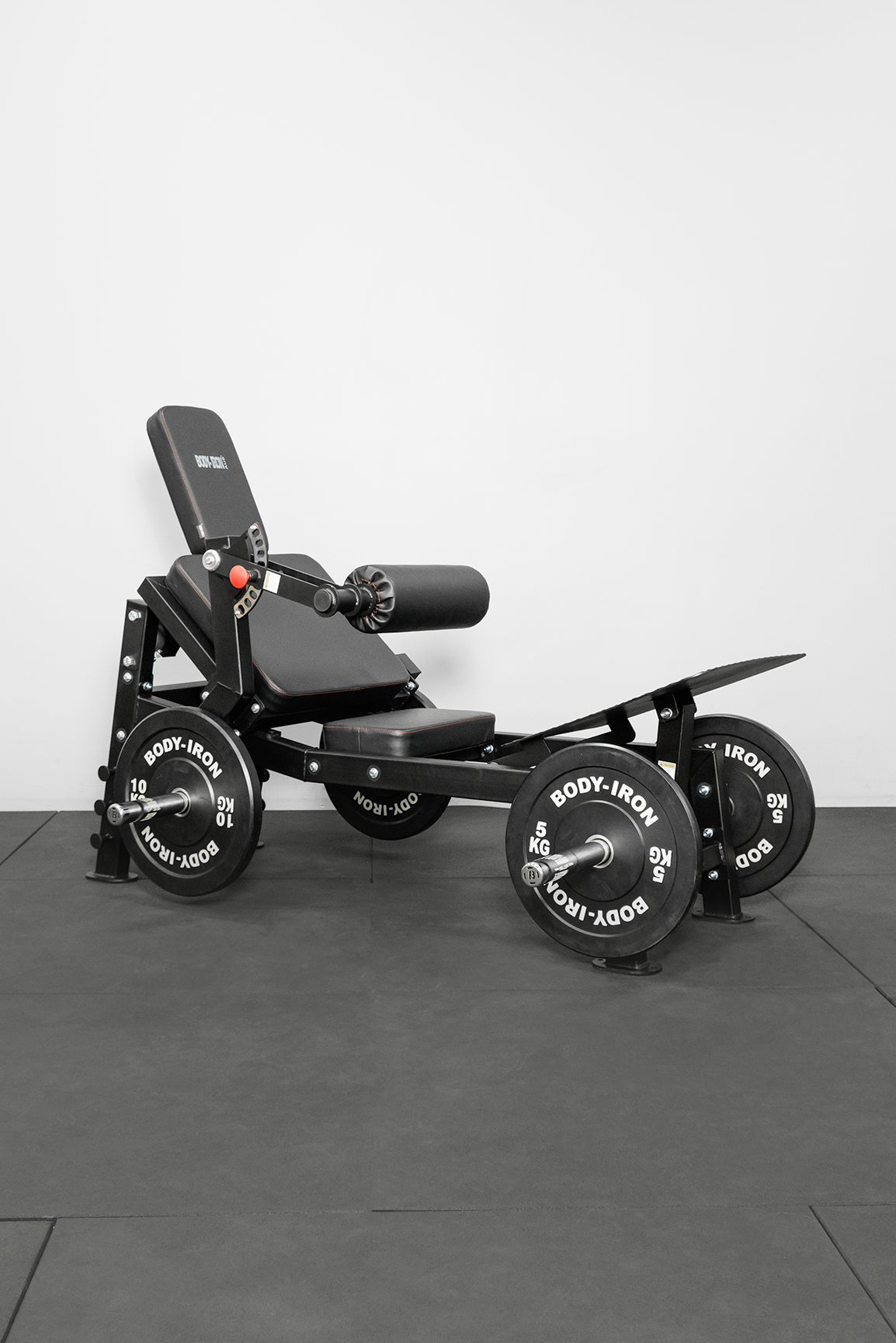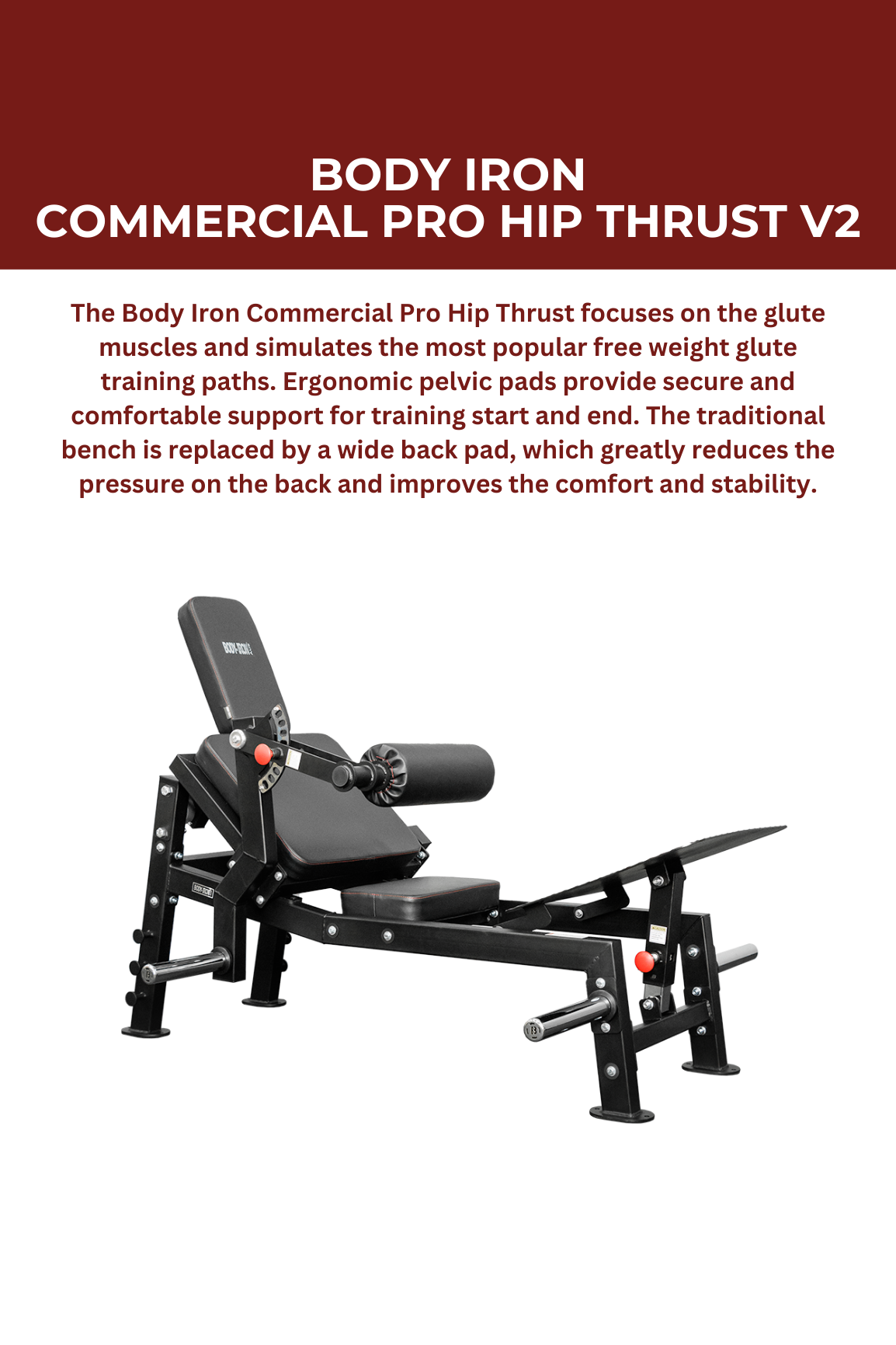 The Body Iron Commercial Pro Hip Thrust targets the glute muscles by simulating popular free weight glute training movements. Ergonomic pelvic pads provide secure and comfortable support for training start and end. The wide back pad replaces the traditional bench, reducing pressure on the back and enhancing comfort and stability.
