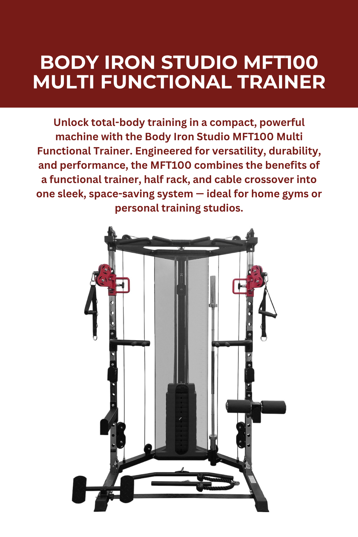 Unlock total-body training in a compact, powerful machine with the Body Iron Studio MFT100 Multi Functional Trainer. Engineered for versatility, durability, and performance, the MFT100 combines the benefits of a functional trainer, half rack, and cable crossover into one sleek, space-saving system — ideal for home gyms or personal training studios.