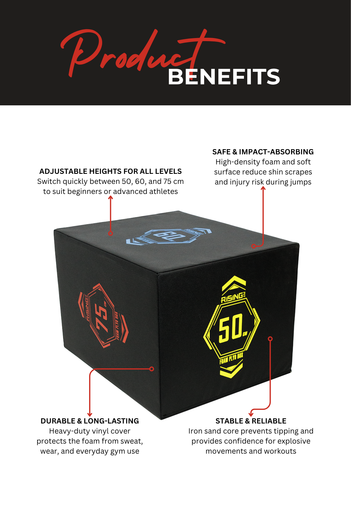 Upgrade your explosive training, conditioning, and strength work with this versatile 3-in-1 Foam Plyo Box. Flip the box to instantly switch between 50cm, 60cm, and 75cm heights—no assembly required. Built with high-density closed-cell foam for firm support and a soft, impact-absorbing exterior to help prevent shin scrapes, it’s ideal for home and commercial gyms alike.