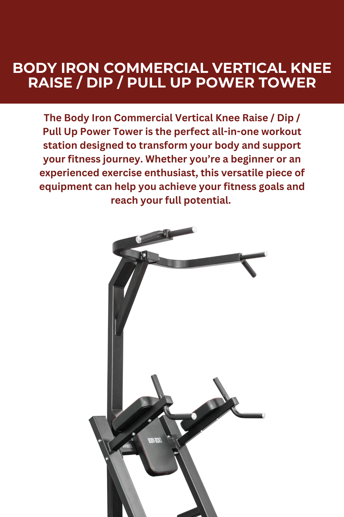 The Body Iron Commercial Vertical Knee Raise / Dip / Pull Up Power Tower is a commercial-grade, all-in-one bodyweight station built to help you develop real upper-body strength and core control. Whether you’re training at home or fitting out a facility, this versatile unit supports a wide range of movements in one compact footprint.