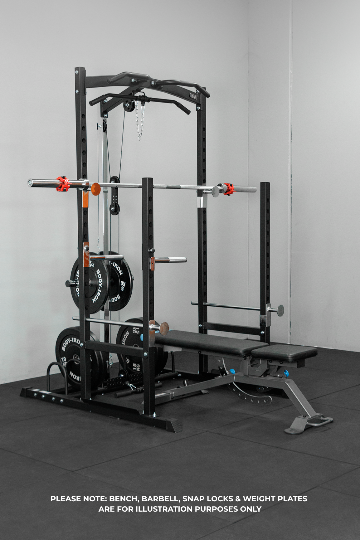 Bench, barbell, and weights not included – shown for illustration purposes only.
