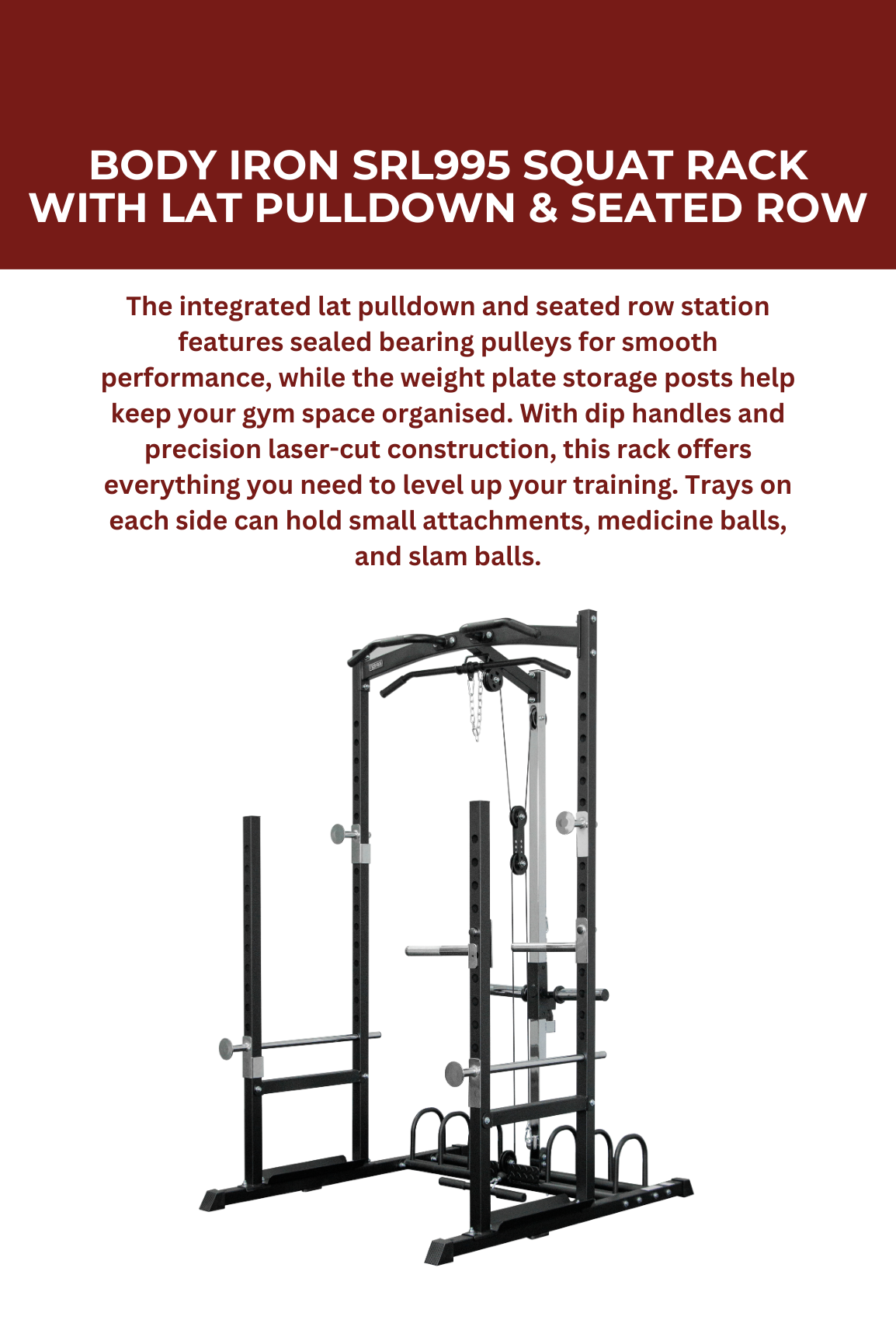 The Body Iron SRL995 Squat Rack with Lat Pulldown & Seated Row is a complete home gym solution built for lifters who want commercial-grade performance at an affordable price. This all-in-one unit allows you to perform a full-body workout — from squats and presses to lat pulldowns and seated rows — all within one compact, efficient footprint.