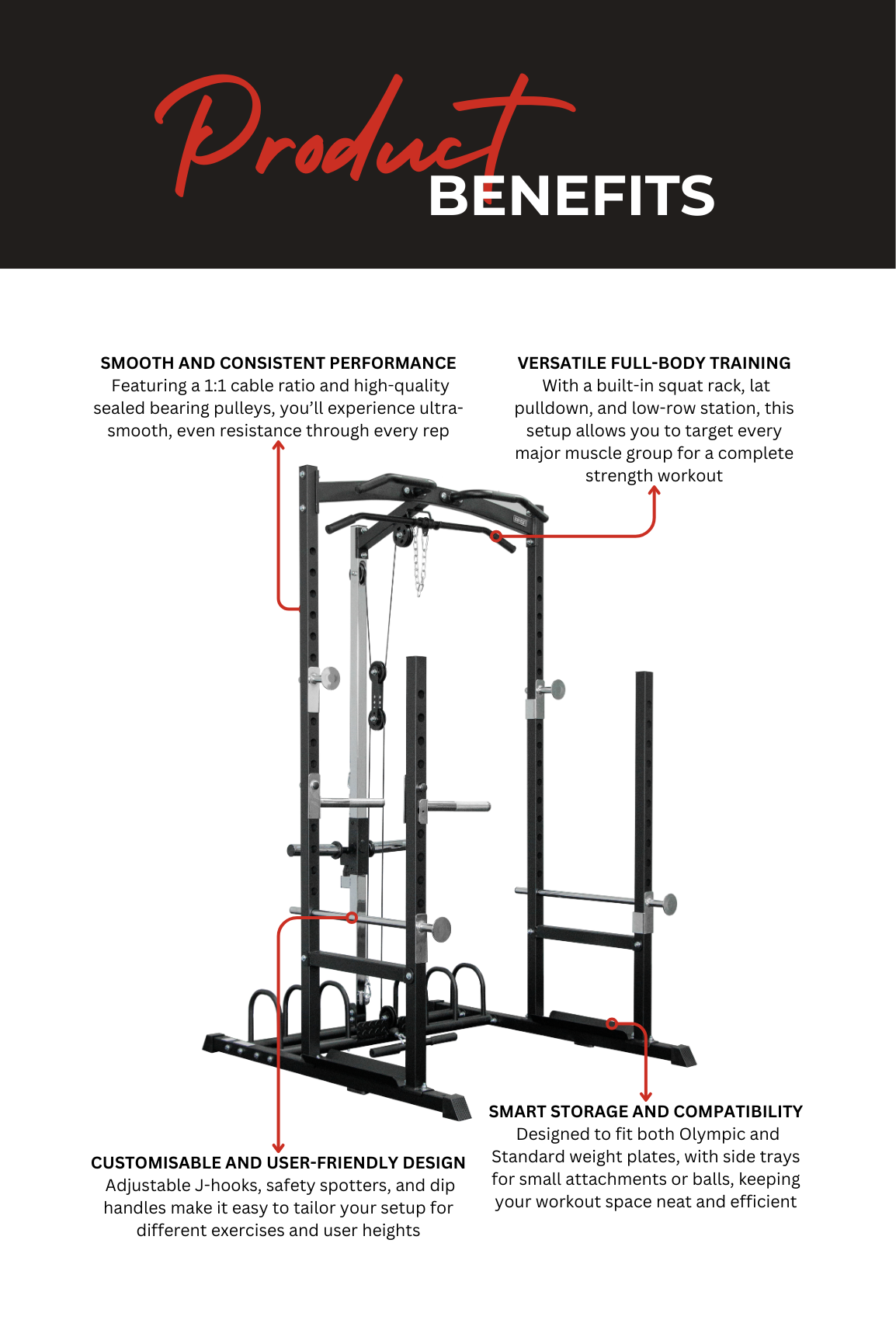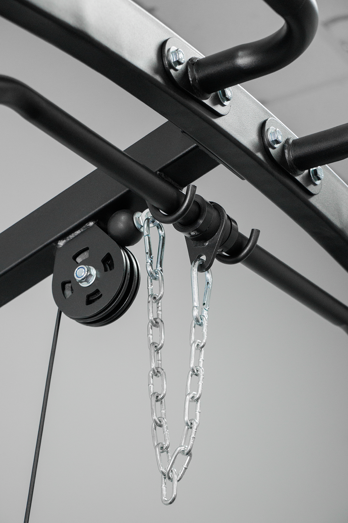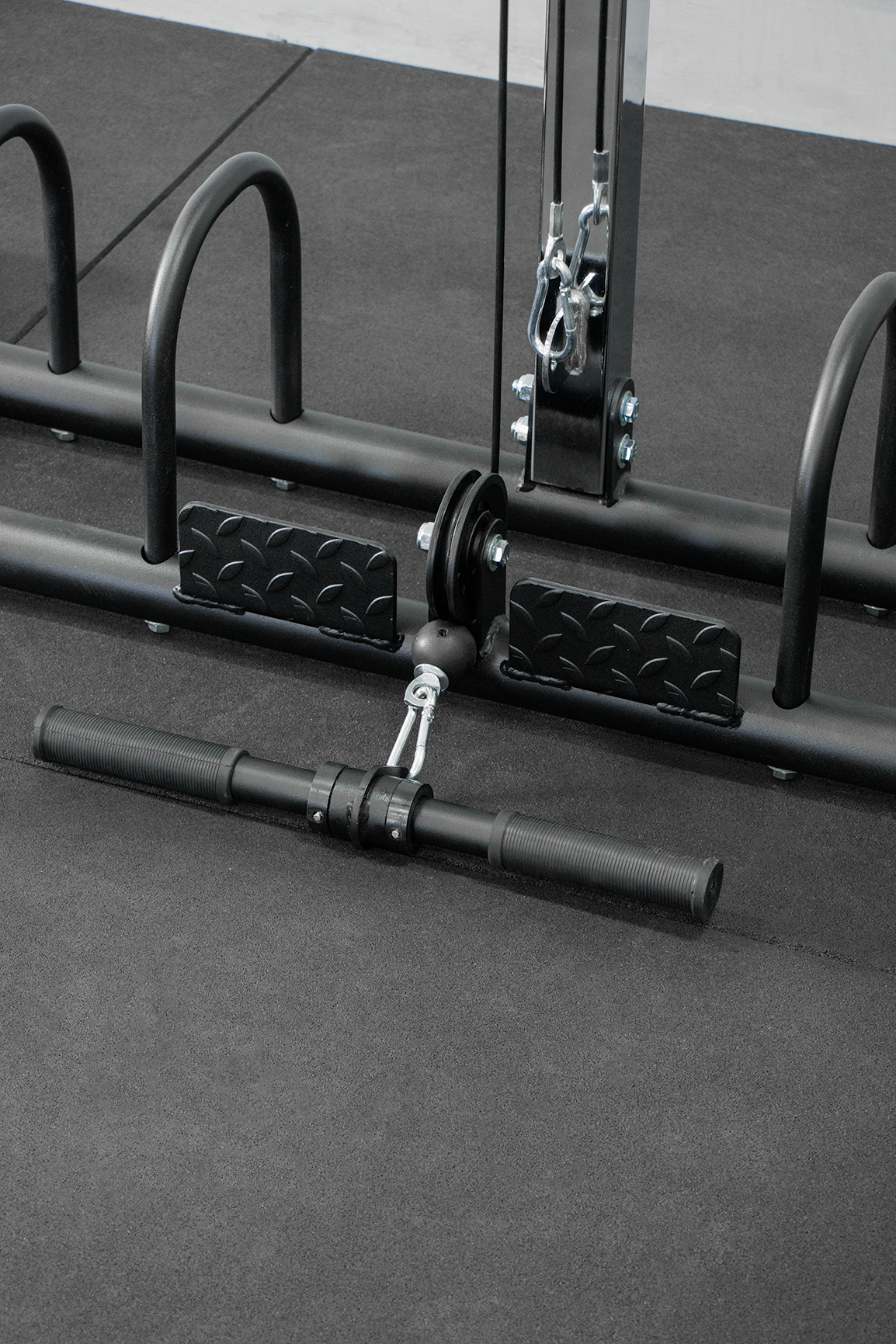 The integrated lat pulldown and seated row station uses sealed bearing pulleys for smooth, consistent movement. Weight plate storage posts help keep your gym neat, while dip handles and laser-cut tubing ensure long-term durability. Convenient side trays allow storage for small accessories, medicine balls, and slam balls.