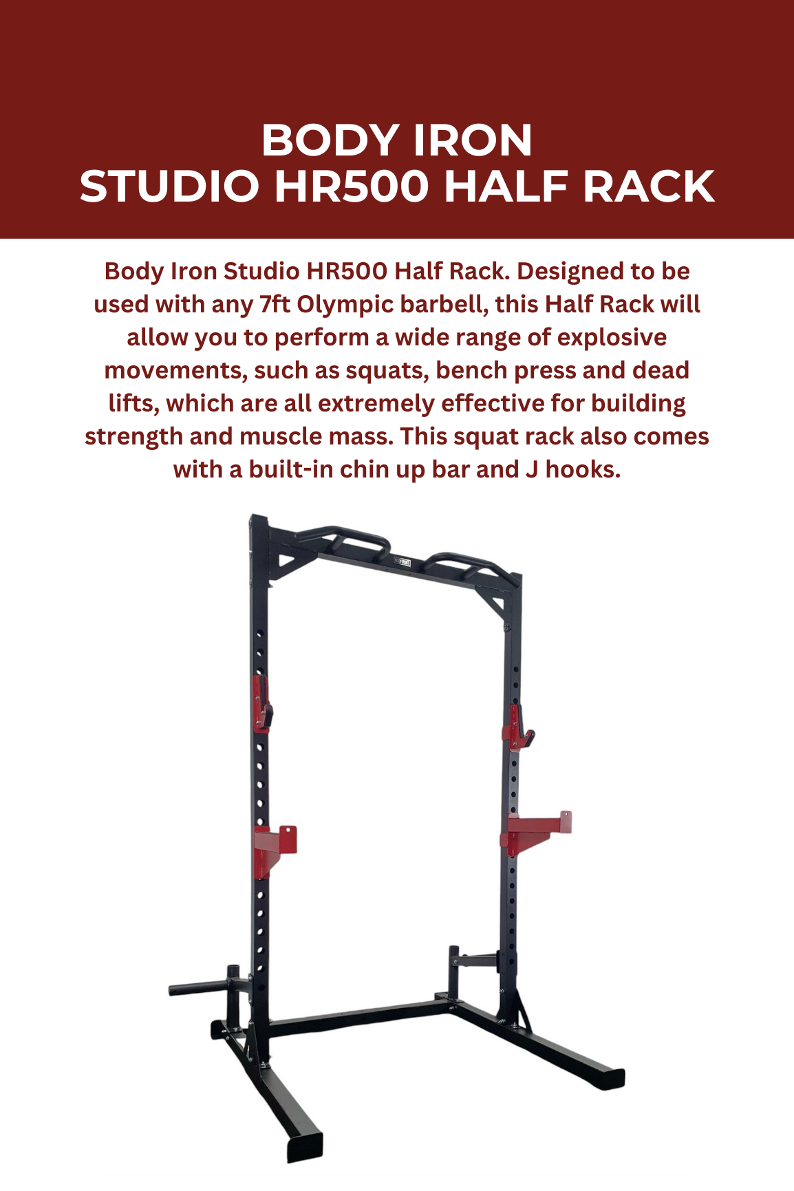 The Body Iron Studio HR500 Half Rack is a heavy-duty, performance-driven squat rack designed for serious strength training. Compatible with any 7ft Olympic barbell, this rack supports a wide variety of compound movements like squats, bench presses, and deadlifts — perfect for building full-body strength and muscle mass from the comfort of your home or commercial gym.
